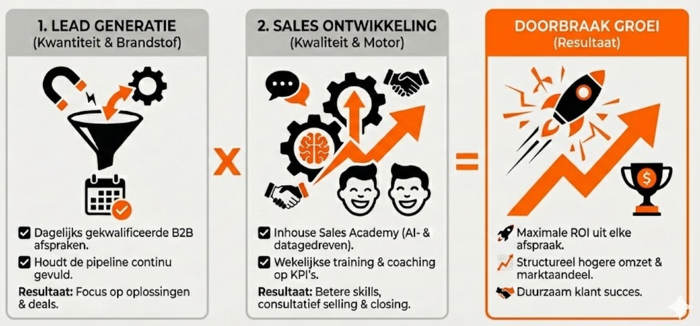Goed volume aan activiteiten voed je sales teams. Wij leveren dagelijks gekwalificeerde B2B afspraken met beslissers bij jullie ideale klanten (de brandstof voor je sales machine) en houden de pipeline gevuld. Zo kunnen jouw sales teams oplossingen presenteren, deals sluiten, relaties openen en klant succes vergroten.